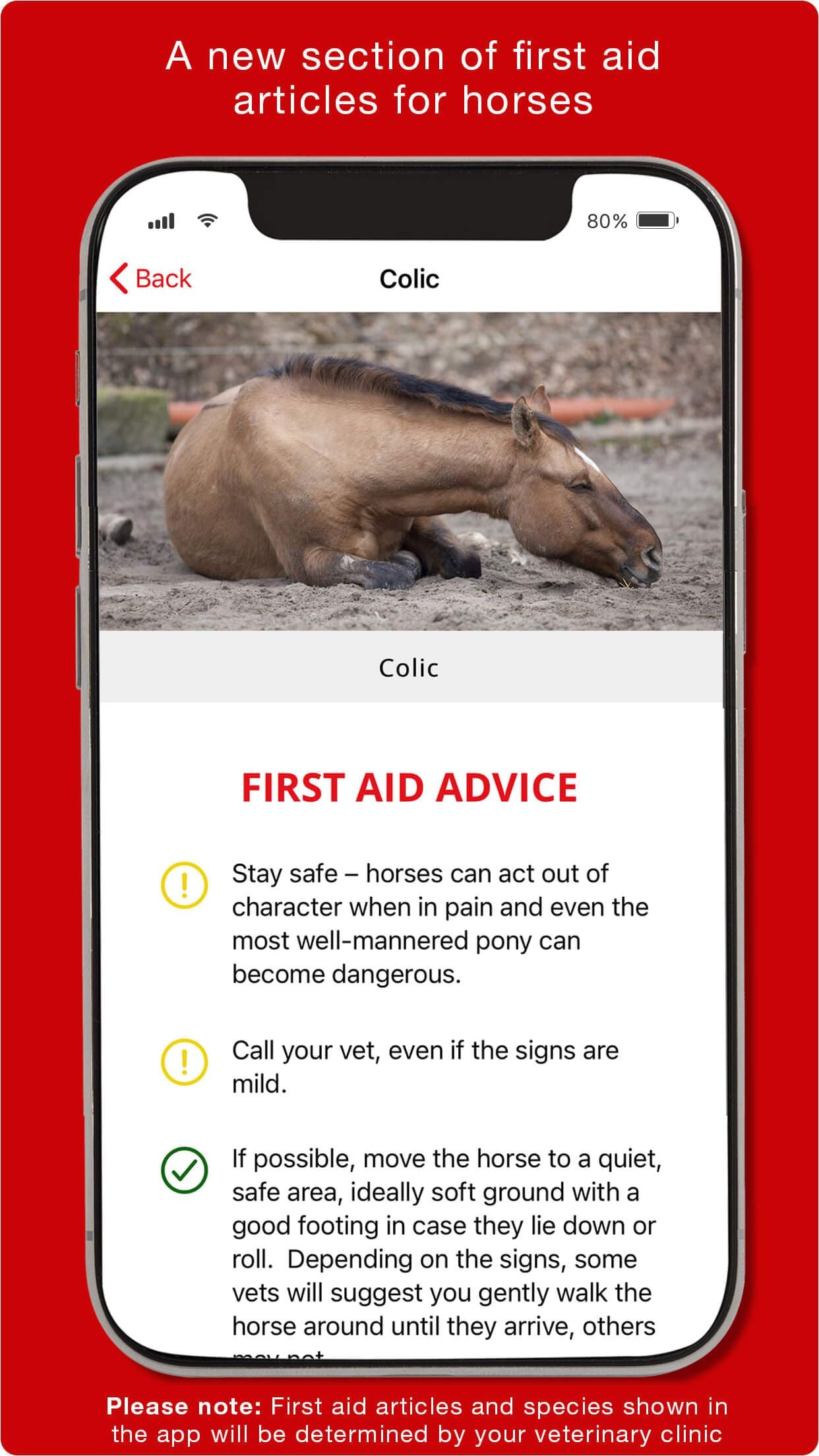 This is a free app available to our clients. It contains relevant and practical first aid advice for situations involving dogs, cats and horses. Owners can search for their local GVG clinic on the app so that the appropriate contact details are on-hand for times of emergency.