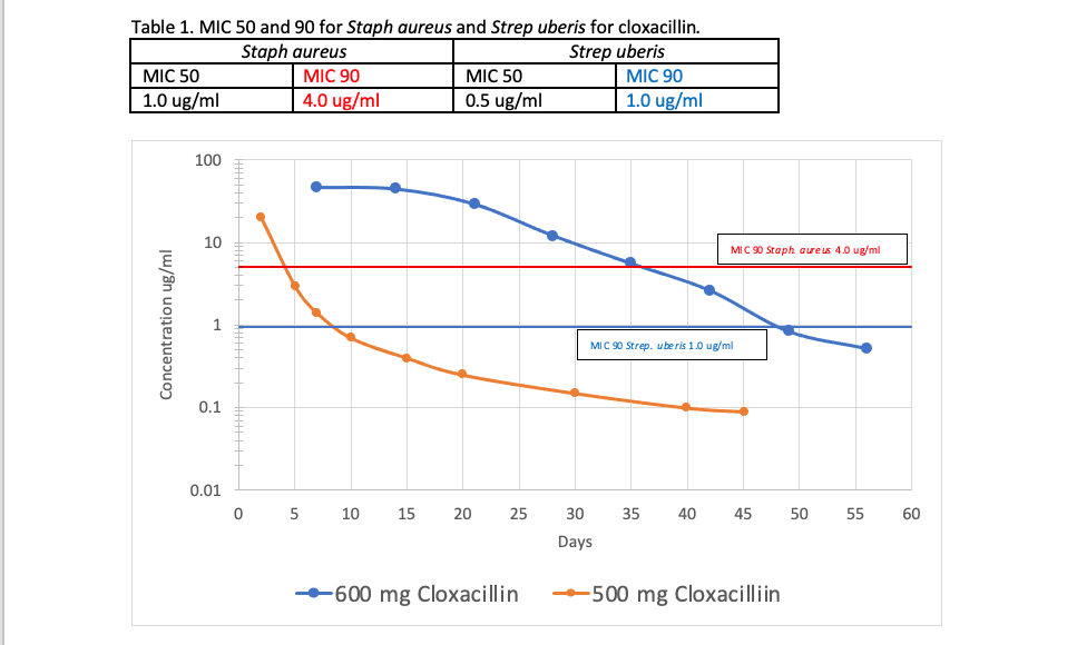 Figure 3. Antibiotic persistence and MIC 90 for Strep. uberis and Staph. aureus (data from a local South Gippsland Herd) for a 500 mg and a 600 mg cloxacillin dry cow product.